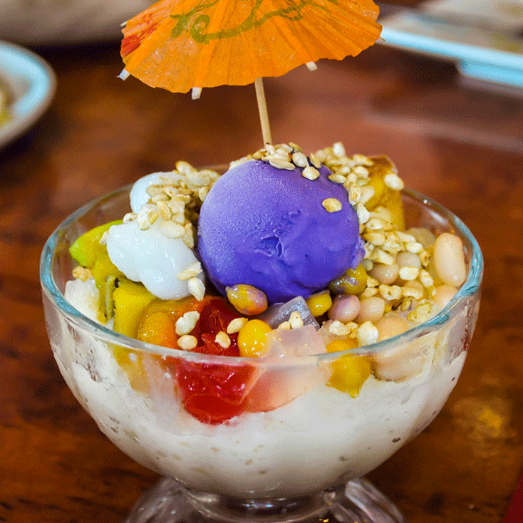 氷は細かく削られ、マンゴーやランサット、ミニバナナ、ジャックフルーツ、アジアンペア、タピオカ、アロエベラゲルなどのフルーツやゼリーがトッピングされます。