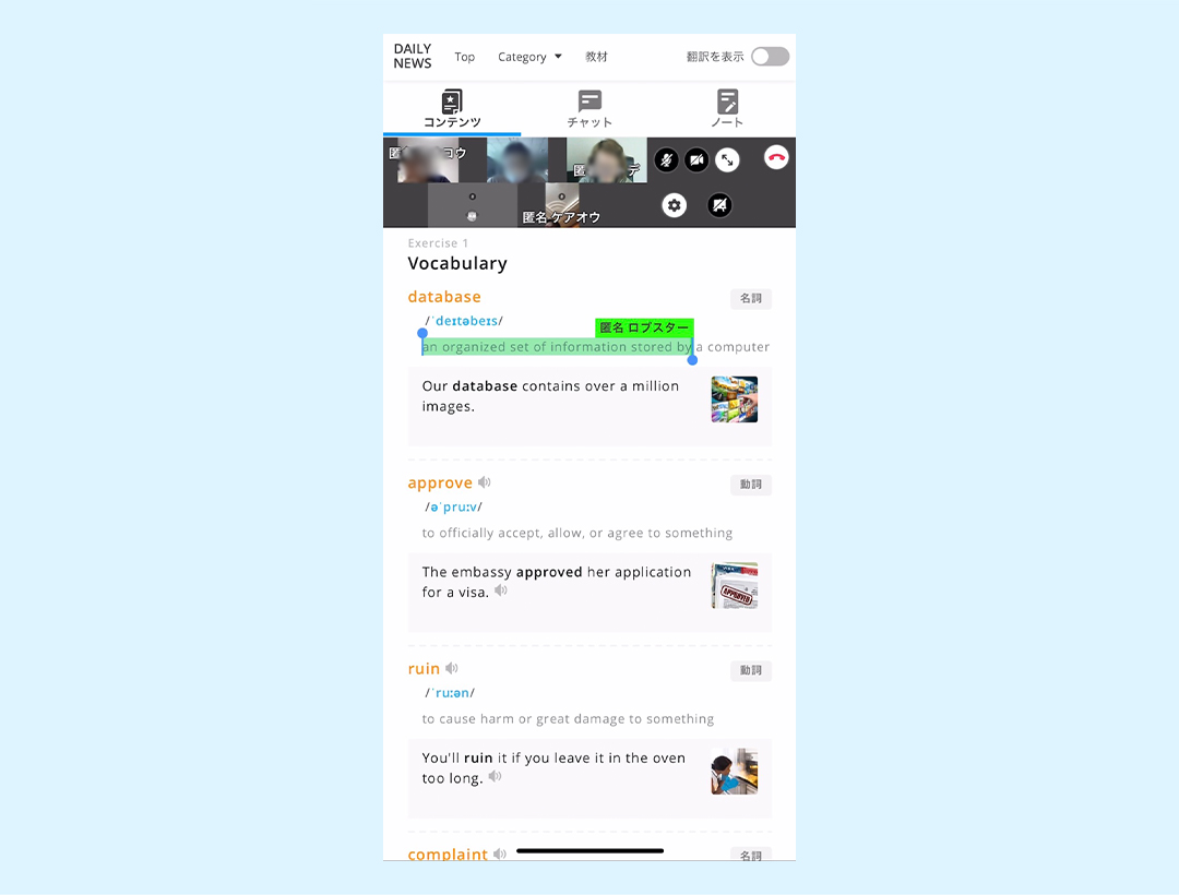 英語のやり取りだけでは難しい質問もチャットで補完することによりレッスンを円滑に行うことができます。